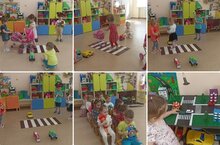 Сегодня ребята поиграли в сюжетно-ролевые игры "Водители и пешеходы" и "Мы едем, едем, едем", закрепили правила перехода через дорогу, вспомнили сигналы светофора.