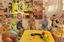 Сегодня с детьми первой младшей группы закрепили знания о характерных признаках овощей и фруктов: цвет, форма, вкус; развивали внимание и ловкость в играх (в огороде выросли); разделили фрукты и овощи по отдельным кантейнерам; развивали сенсорные ощущения детей; повторяли названия и цвет овощей и фруктов за воспитателем; проявлял положительные эмоции при физической активности.