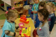 В средней группе воспитатель Сергеева Л.Х. провела беседу о работе продавца и познакомила детей с правилами поведения в магазине. После беседы было предложено поиграть в сюжетно-ролевую игру «Магазин», где дети учились распределять роли и действовать согласно принятой на себя роли, развивали сюжет; так же во время игры дети обогащали свой словарный запас (продавец, покупатель, очередь, товар, сдача).
