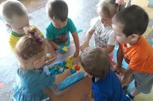 Одно из самых лучших развлечений для детей появилось в младшей группе. Это необычный, разноцветный кинетический песок. Игры с кинетическим песком – это не просто время провождение, это много новых эмоций, радостных впечатлений. Дети сами тянутся к песку, а воспитателям остается только придать этой тяге творческую составляющую. С большим удовольствием ребята играют в игры с кинетическим песком, делают различные отпечатки, строят башенки. Песочная терапия развивает психомоторные навыки, пространственное мышление, речь, воображение и творческие способности малыша, кроме того, пробуждает интерес к познанию окружающего мира природы.