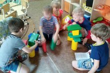 Взрослым часто кажется, что кубики простейшая игрушка. И правда, что может быть проще поставить один кубик на другой, а сверху поставить третий, вот и башенка. Но не тут-то было. Сегодня ребята средней группы так увлеклись постройкой домика, что превратили его в сказочный дворец с дорожками, качелями и скамейками. Воспитатель Шивирева Р.Р. внесла дополнительные элементы из киндер-сюрпризов и мелких игрушек, и сразу оживилось детское творение. В ходе игры у детей развивается интерес к конструктивной деятельности, ребята учатся работать в коллективе и объединять свои постройки, при этом договариваться друг с другом.