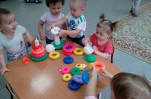 С каким усердием и упорством собирают пирамидки ребята малыши. Эта уникальная игрушка с давней историей, не потерявшая актуальности до сих пор и скорее всего в дальнейшем также будет востребована. Пирамидка растет вместе с малышами, которые играя с ней, развиваются быстро и гармонично. Это очень полезная игрушка, во время действий у ребенка развивается логическое мышление, он учится компоновать фигурки по цвету, размеру и форме. Все это отличная тренировка координации движений и моторики. Что и пытаются сделать воспитанники первой группы раннего возраста. Непросто собрать пирамидку, нужно перебрать ручками множество фигурок, после чего попасть отверстием на стержень. Удачи ребятам в освоении всего нового!