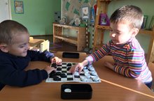 "Мудрые игры" поселились в средней группе нашего детского сада. Воспитатель Ахметзянова Е.В. внесла в группу новую игру «Шашки». Воспитанники с радостью принялись рассматривать и слушать о том, как нужно играть в эту необычную игру, какие правила нужно выполнять. Кто-то уже знает об этой игре, и попытались показать свои умения. Но самое главное игра в шашки служит для развития логического мышления, сообразительности, учит мыслить, воспитывает усидчивость, умение проигрывать, умение уступать, работать в парах. Дошкольник, который играет в шашки, привыкает самостоятельно думать, принимать решения, не унывать при неудачах. И будем надеяться, что в скором времени ребята средней группы уже будут устраивать шашечные баталии.