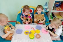 Сегодня дети 1 младшей группы разыграли сюжет «Звери обедают». Собачка, обезьянка, кошка и мишка пригласили детей в гости. Ребята круговыми движениями слепили мишке ягодки, кошке колбаску, обезьянке бананы, собачке косточки. С удовольствием вовлеклись в двигательную активность, и всё это вызвало эмоциональное радостное настроение.