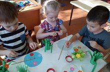 14 нче март көнне уртанчылар төркемендә тәрбияче Григорьева В.Б. бер төркем балалар белән кисеп ябыштыру күнекмәләрен үстерү максатыннан индивидуаль эш алып барды. Балалар бик теләп кайчы белән төрле чәчәк, яфрак формалары кисеп, букет ясадылар. Ясаган букетлар балалар күңеленә хуш килде.