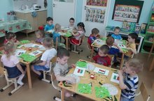 2 ноября 2017 года воспитатель Агзамова Г.Х. во 2 младшей группе провела занятие по аппликации, посвященное Дню Конституции Республики Татарстан. Дети совместно с воспитателем клеили флаг РТ. Воспитатель рассказала детям , из каких цветов состоит флаг РТ. Дети узнали, что флаг состоит из 3 цветов: зелёный -зелень весны, возрождение; белый-цвет чистоты, мир; красный - сила, энергия, жизнь. Все дети аккуратно и красиво приклеили флаги на белые листочки и любовались своими работами.