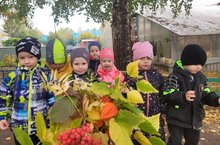 С воспитанниками второй младшей группы в один день, выйдя на прогулку, долго любовались и восхищались красотой осенних деревьев. Дети познакомились со многими деревьями, узнали их названия и характерные особенности. Затем не удержались и собрали удивительно красивый букет из осенних листьев и веток различных деревьев.