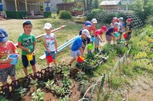 Наступила пора жаркого лета. Воспитанники средней группы, вооружившись лейками и ведерками, поливают лук, горох, а также ухаживают за цветами на клумбах. Такая забота о растениях и овощах сулит хороший урожай осенью.