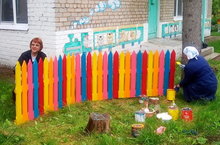 Творческая группа детского сада в составе: Антонова З.И., Шарафиева Г.З., Дмитриева М.В. оформляют территорию яркими поделками.