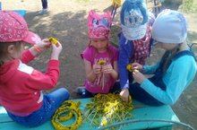 Весна и лето пора цветов и разнотравья и великолепная возможность для приобщения детей к истокам русской народной культуры - плетение традиционного оголовья, венка из цветов. Мы помним, как сами в детстве учились плести веночки из одуванчиков и теперь передаем свои умения и любовь к традициям подрастающему поколению. Сегодня дети старшей группы "Медвежонок" познакомились с технологией плетения венка. Собрав одуванчики на участке детского сада, ребята принялись за кропотливую, но интересную работу. И вскоре сплели свои первые веночки -