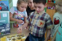Ранее ребята посадили газонную траву в скорлупу, в течение недели дети сами поливали с помощью пипетки, наблюдали и вот появились первые всходы.