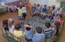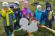 Прогулка является очень важным режимным моментом жизнедеятельности детей в ДОУ. На прогулке дети не только играют в подвижные игры, но и получают много новых впечатлений и знаний об окружающем. В первой младшей группе "Зайчонок" воспитатель Ю. И. Муханова на прогулке закрепляла знания своих малышей о Петушке, посредством потешки "Петушок, петушок Золотой гребешок".