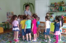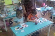 В старшей группе "Комарик" сегодня рисование на тему "Городецкая роспись". Воспитатель Заремба О.В. показывает детям приемы рисования, учит выстраивать композицию, подбирать краски.