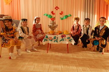 В дружном хороводе закружились детки в национальных костюмах в игре «Тюбетейка». Воспитанница гр. «Колосок» Рахимова Нигина станцевала таджикский танец. А Семенова Лера танцевала в паре с гостьей - бабушкой татарский танец. В завершении, все участники «Посиделок» исполнили танец «Мин сине яратам».