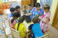 В самом начале преподаватель татарского языка Хуснутдинова Гульнара Дамировна закрепила с детьми пройденный материал «Овощи». После этого в гости на огонек заглянула татарская бабушка с гостинцами в корзине. Младший воспитатель гр. «Солнышко» Кагирова Залида Сунгатуловна обыграла все предметы, в игре «Что есть в корзине?»
