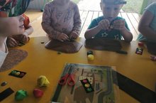 Вот и сегодня, наши мальчики и девочки отгадывали загадки про дорожные знаки, собирали из чёрных и белых полосок пешеходный переход, играли в подвижные игры «Светофор», «Пешеходный переход», с игрушечными машинками осваивали водительское мастерство и из пластилина лепили трёхглазого друга.