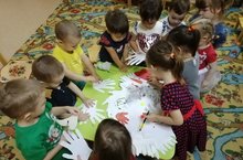 Воспитанники самой младшей группы «Колобок» выполняли поделку «Снеговик» из бумаги, применяя нетрадиционную технику выполнения поделки из вырезанных ладошек малышей и их родителей. Сделанный нами снеговик вывешен в группе, дети обращают внимание сами и привлекают внимание родителей. Тем самым способствуют привлечению родителей к оформлению группы поделками, сделанными своими руками. Такой вид работы развивает мелкую моторику, творческое воображение, фантазию, воспитывает усидчивость, аккуратность, интерес к работе в технике «Аппликация из ладошек».