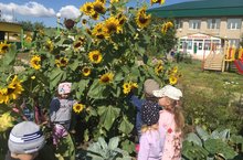 Сегодня на прогулке мы с ребятами рассмотрели подсолнух, выращенный на нашем маленьком огородике, провели беседу «Подсолнухи», отгадывали загадки.