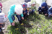 Сегодня на прогулке мы с малышами любовались цветочной поляной. На этой поляне растут одуванчики. Одуванчик очень любопытный цветок. Одуванчик назван солнышком, потому, что его цветок желтого цвета, круглый и похож на солнышко. Сначала появляется зеленый бутон, который раскрывается в желтый цветок, затем на месте лепестков появляются белые пушинки - зонтики, с помощью которых ветер разносит семена цветка.
