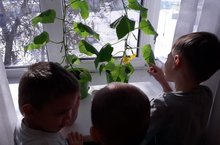 Сегодня наши детки с интересом наблюдали за огурцами, посаженными ими на «огороде на подоконнике». Цель наблюдения - знакомство детей с овощным растением – огурец. Формирование первичных представлений о частях растения: стебель, листья, цветок и огурец – плод. Способствование развитию тактильных ощущений через поглаживание листьев и плода. Способствование обогащения жизненного опыта и представлений об окружающем природном мире.