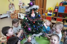 Новый год - это волшебный праздник. Особые чувства он вызывает у детишек: подарки, добрый Дедушка Мороз, огоньки повсюду и много-много радости и веселья! Также дети испытывают особый восторг от новогодней елочки. Она выглядит необыкновенно празднично, а в новогоднем няряде - просто сказочно! Наряжать елку - приятное занятие даже для взрослых! В преддверии Нового года мы с нашими малышками решили украсить нашу ёлочку, которая встречает наших детишек каждое утро в коридоре их группы. -