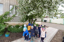Самые маленькие воспитанники нашего сада отправились в путешествие по территории детского сада и наблюдали за цветущей яблоней. Дети учатся замечать изменения во внешнем виде деревьев, видеть красоту ярких красок весны; знакомятся с особенностями весеннего состояния плодовых деревьев (цветение); любуются цветущими деревьями.