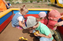 У нас сегодня «День песочных замков». Дошкольники беседовали о том, что можно построить из песка. Дети рассматривали иллюстрации с изображением песочных замков, играли в строительную игру «Грузим песок и отвозим к морю». И закипела работа в песочницах. Все ребята приложили максимум фантазии, оформляя наш «замок».