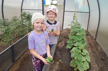 Дети вместе с воспитателями посадили семена огурцов, ухаживали за рассадой, пололи, поливали, привязывали плети и, конечно же, наблюдали за ростом огурцов. И вот наконец-то наступил день сбора урожая. Огурцы выросли отменные. Сначала дети снимали урожай огурцов, а затем все дружно съели огурцы, выращенные своими руками. Было очень вкусно.