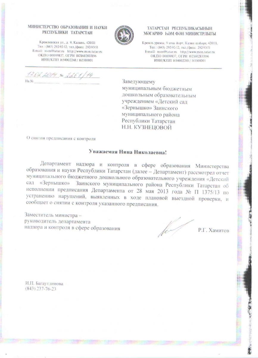 Предписание департамента надзора и контроля в сфере образования МОиН РТ №П 1375/13 от 28.05.2013
