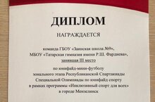 Команды Татарской гимназии и "Заинская школа №9" заняли третье место в зональном этапе по юнифайд - мини -футболу, Республиканской Спартакиады в в рамках программы "Инклюзивный спорт для всех", который прошел в городе Мензелинск.