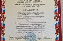 В III Республиканском лингвистическом конкурсе "Вечный язык"- "Eternal Language", посвященный творчеству Уильяму Шекспира, стала ПРИЗЁРОМ ученица Татарской гимназии ВАФИНА ЭНЖЕ РАФАЭЛЕВНА.
