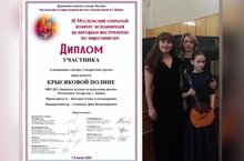 С 1 по 8 июня прошёл III Московский открытый конкурс исполнителей на народных инструментах.Нашу школу представила Крысякова Полина (домра) вместе с концертмейстером Семеновой Диной Владимировной (преподаватель Коклина Елена Александровна). -