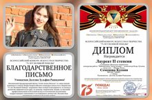 25 мая в Москве проходил Всероссийский онлайн конкурс искусств и творчества "75 лет Великой Победы". В номинации вокал( соло) Семёнова Ксения стала лауреатом ll степени ( руководитель Долгова Зульфия Рашидовна)