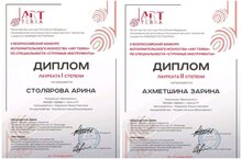 В Уфе прошёл V Всероссийский конкурс исполнительского искусства "АRT Terra" (струнные инструменты). В нём принимали участие учащиеся класса преподавателя Кадыровой Люции Павловны Ахметшина Зарина и Столярова Софья. В составе жюри были педагоги из Средней специальной музыкальной школы г. Уфы и Казанской государственной консерватории. Наши виолончелисты стали лауреатами: Столярова Арина - l степени (концертмейстер Варламова Алина Владимировна), Ахметшина Зарина (концертмейстер Рыцова Светлана Вячеславовна) - ll степени. Поздравляем конкурсантов и их педагогов с победой!