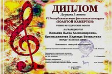 14 марта 2021 года были подведены итоги VI Республиканского фестиваля-конкурса "Золотой Камертон" учебно-методических работ в городе Казани. В номинации "Сценарий мероприятий" преподаватели нашей школы Коклина Елена Александровна и Красильникова Надежда Васильевна стали Лауреатами I степени.