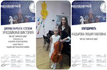 1 марта в Казани состоялся Международный конкурс искусств "Вдохновение" в заочном формате. В номинации "Струнно-смычковые инструменты. Виолончель. Соло" Кушникова Аделина стала лауреатом II степени (класс преподавателя Кадыровой Люции Павловны, концертмейстер Кускова Елена Александровна).