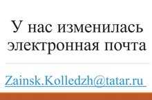ГАПОУ "Заинский политехнический колледж" сообщает, что изменилась электронная почта. Теперь ваши сообщения можете присылать на Zainsk.Kolledzh@tatar.ru