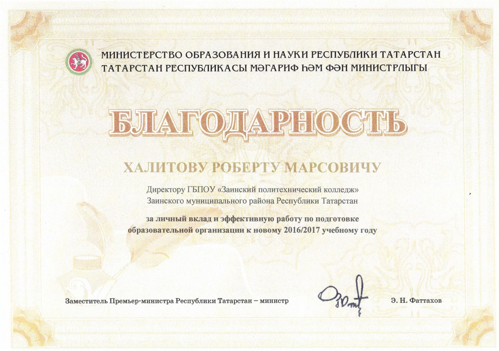 Опубликовано: 20.10.201619 октября 2016г. в Казанском педагогическом колледже в рамках совещания «Вопросы развития профессионального образования в Республике Татарстан» были вручены Диплом Лауреата в номинации «Лучшая профессиональная образовательная организация» и Благодарственное письмо директору колледжа за личный вклад и эффективную работу по подготовке образовательной организации к новому 2016/2017 учебному году.