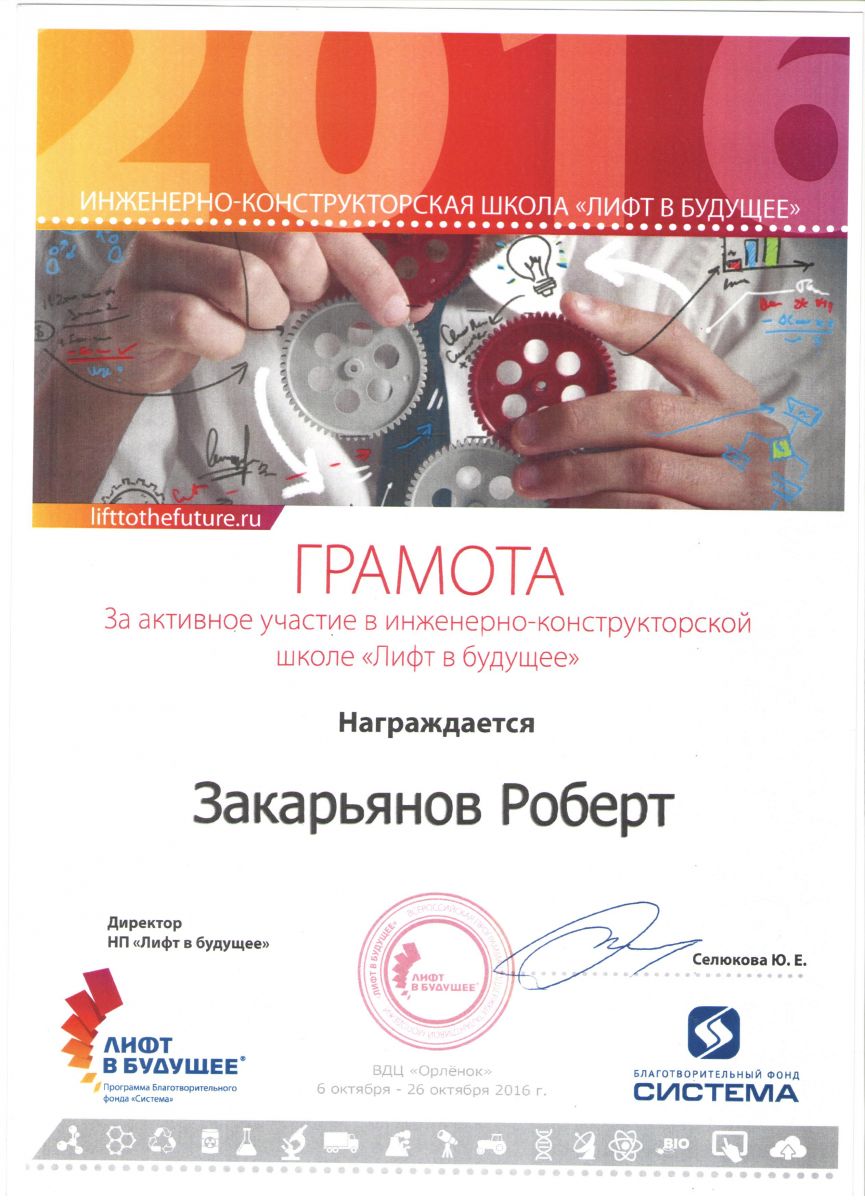 Опубликовано: 01.11.2016С 6 по 26 октября студент III курса Заинского политехнического колледжа группы 1441 Закарьянов Роберт прошёл учёбу по проектной деятельности в рамках инженерно – конструкторской школы «Лифт в будущее» по направлению Энергетика. Учёба проходила во Всероссийском детском центре «Орлёнок» Краснодарского края. Из 152 участников школы 9 были представителями Татарстана. Колледж гордится тем, что одним из девяти стал студент Заинского политехнического.