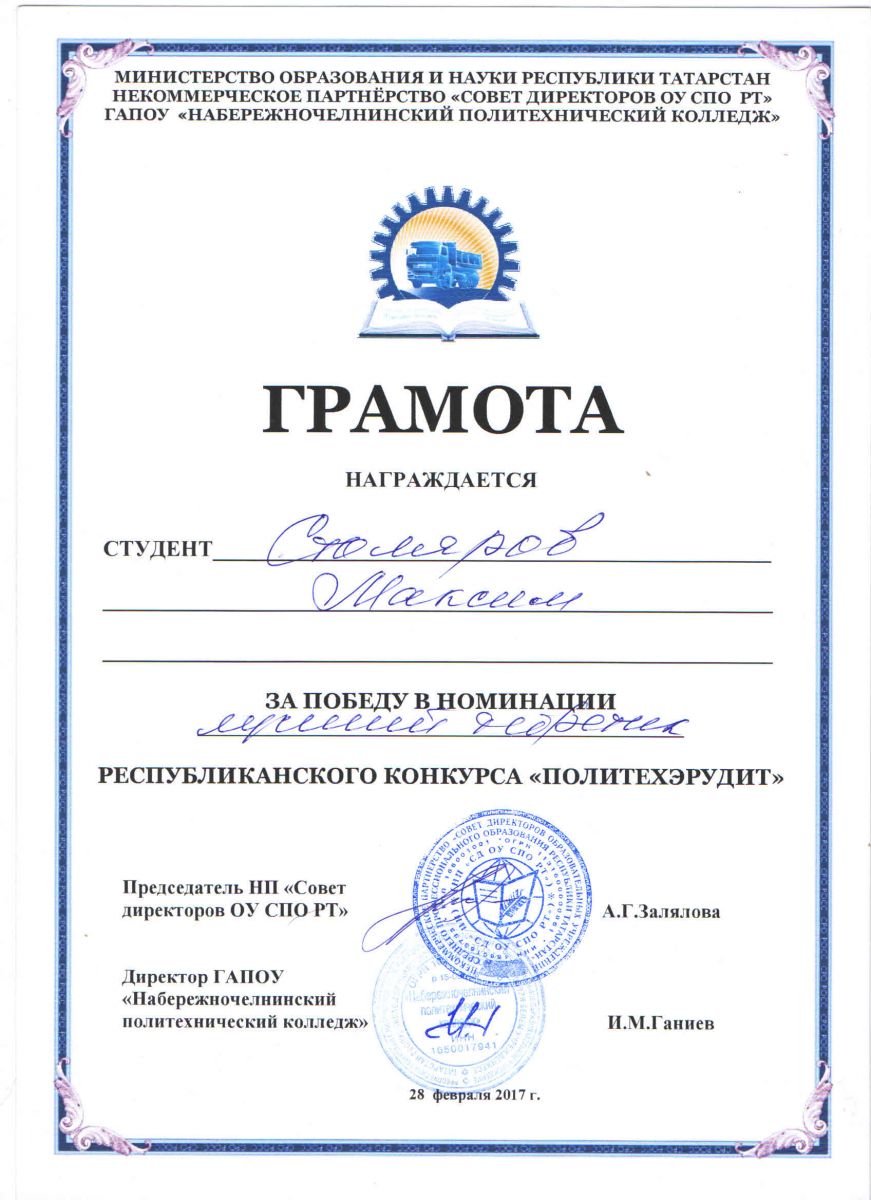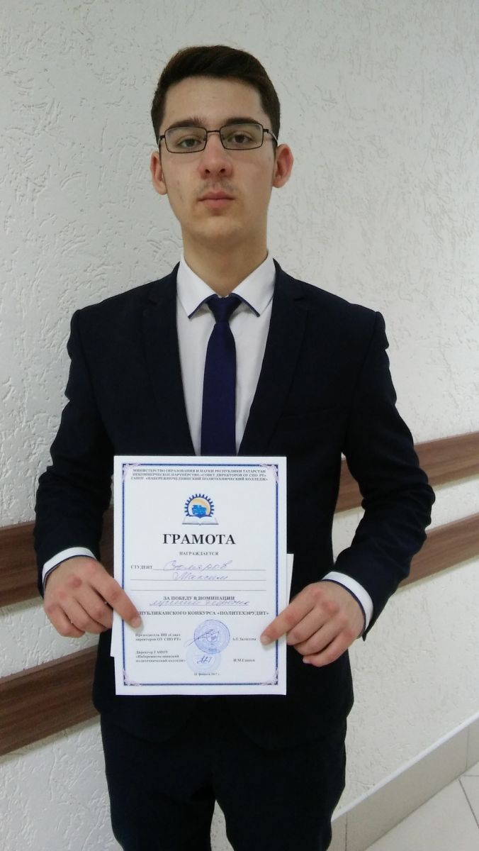 Опубликовано: 28.02.201728 февраля 2017 года в ГАПОУ «Набережночелнинский политехнический колледж» состоялся конкурс «Политехэрудит». Студент группы 1251 Столяров Максим достойно представил колледж и стал победителем в номинации «Лучший теоретик».
