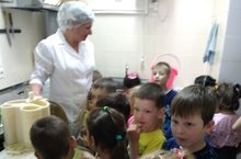 Для детей средней группы «Золотые зёрнышки», была организована экскурсия на пищеблок дошкольного учреждения, где ребята познакомились с профессией повара. Воспитанники увидели, какие кухонные предметы, машины, и посуда используются для приготовления пищи, как обрабатывают продукты. Рассуждали о том, что повару нужна спецодежда для того, чтобы защитить себя от горячей жидкости, жара печи. Говорили об ответственности повара, что он должен знать технологию приготовления детских блюд. Экскурсия на пищеблок способствовало накоплению ярких эмоциональных впечатлений детей, вызвал интерес к профессии повара, к разнообразным блюдам.