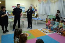 Инспектор напомнил правила перевозки детей в автомобиле, рассказал о необходимости использования детского кресла и ремня безопасности. Дети с интересом слушали гостей, рассказывали им, что знают о светофоре и пешеходном переходе. В конце Вадим Валентинович подарил набор пазлов «Дорожные знаки» и развивающие книги.