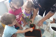 С целью формирования бережного отношения к комнатным растениям и трудовых навыков, а также развития желания ухаживать за ними воспитанники второй младшей группы «Энҗе бөртекләре» под руководством воспитателя Чумаковой А.П. пересаживали комнатные растения алоэ и хлорофитум. Воспитатель пояснила, что корни должны быть в земле, что нужно обжать землю у основания стебля. После посадки дети поливали цветы.