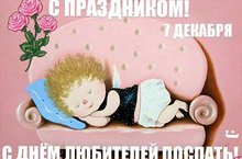 7 декабря День любителей поспать.Этот праздник, посвященный одному из самых загадочных процессов организма человека сну. Доказано, что недостаточная продолжительность суточного сна у человека приводит к различным расстройствам в здоровье человека. Регулярная нехватка сна влечет за собой хроническую раздражительность, зацикленность на проблемах, ухудшение взаимопонимания с окружающими. Единоразовый недосып на 4 часа снижает реакцию почти в 2 раза, а также внимание, память, обостряет хронические заболевания. Сон настолько важен для человека, что праздников у него несколько. К примеру, 27 июля отмечается День сони в Финляндии, а 7 декабря неофициально отмечается День любителей поспать. А есть еще День сна в общественных местах – 28 февраля. Его еще называют День сна в публичных местах – и он тоже неофициальный.