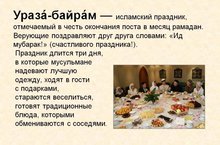 Ураза-Байрам — один из главнейших мусульманских праздников, когда верующие отмечают окончание священного месяца Рамадан. Завершив очистительный пост, мусульмане начинают подготовку к празднику: убираются дома и рядом с ним, готовят праздничный обед. В день праздника обязательно нужно раздавать милостыню бедным, давая им или деньги, или продукты. В день праздника принято ходить друг к другу в гости, навещать родственников, в том числе умерших, посещая их могилы. Это день радости и улыбок.