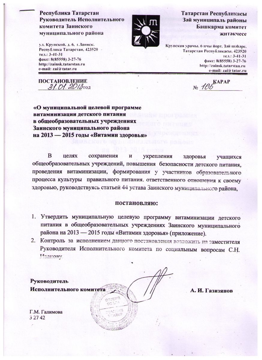 Постановление Исполнительного комитета по муниципальной целевой программе "Витамин здоровья"