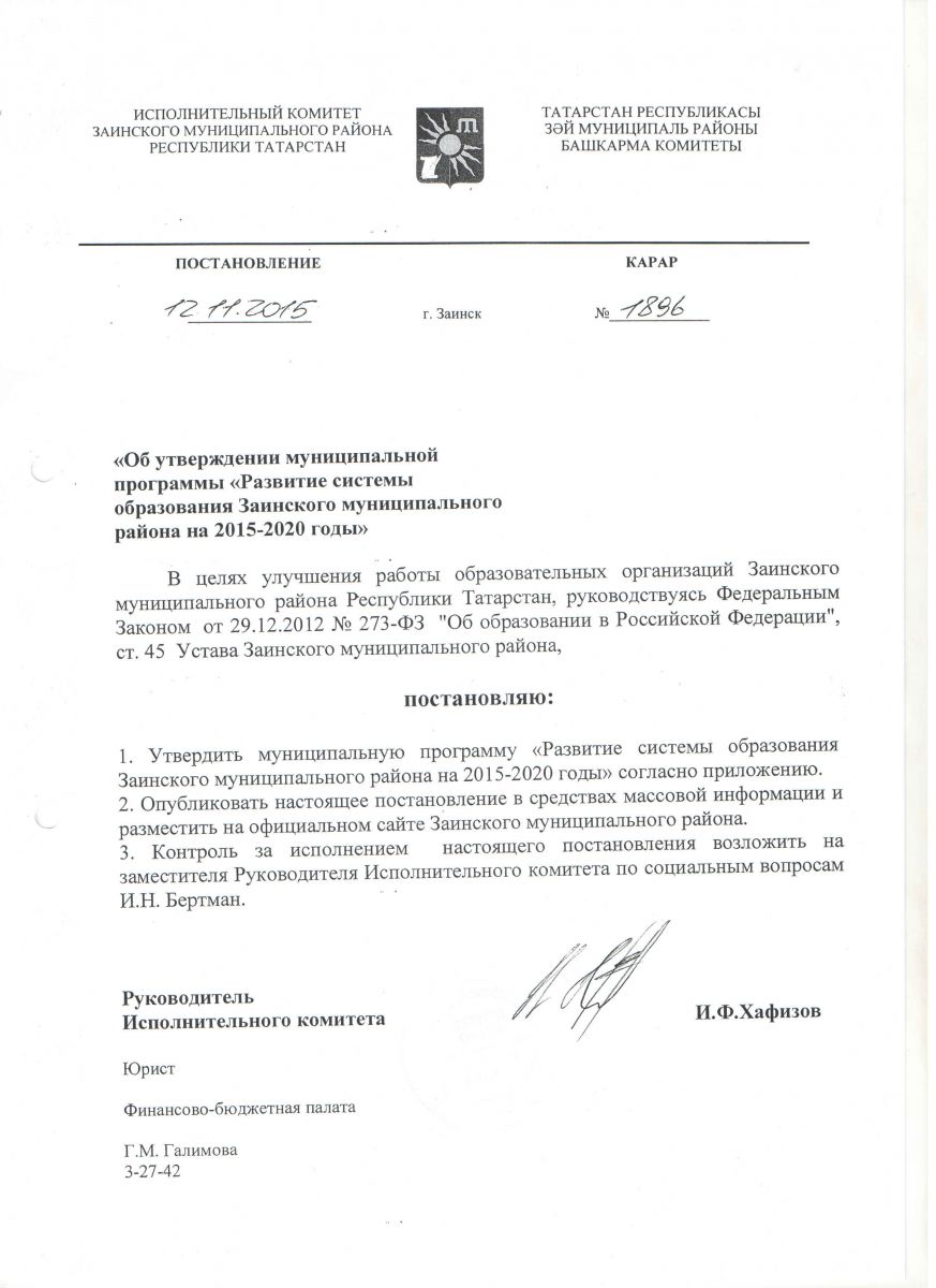 Постановление Исполнительного комитета по муниципальной программе "Развитие системы образования Заинского муниципального района на 2015-2020 годы"