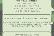 20 октября 2021 года состоится горячая линия по вопросам соблюдения прав граждан при призыве на военную службу. Консультации проводятся с 9.00 до 16.00.