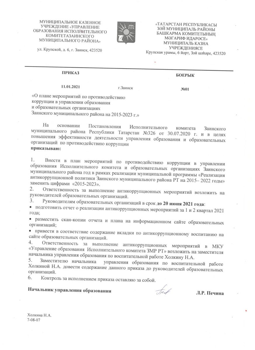 Приказ и план МБОУ "Сарсаз-Багряжская ООШ" по противодействию коррупции