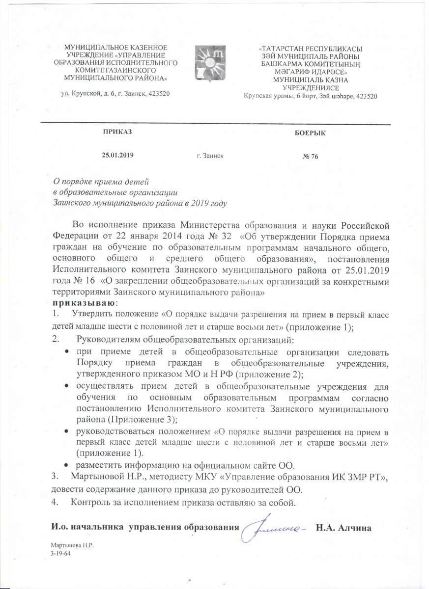 Приказ МКУ "Управление образования ИК ЗМР РТ" №198 от 21.03.2025 года "О порядке приема детей в образовательные организации Заинского муниципального района"